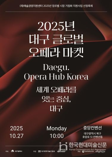 한국현대미술신문 정소영 기자 | (재)대구문화예술진흥원 대구오페라하우스는 문화체육관광부와 예술경영지원센터가 추진하는‘2025 장르별 시장 거점화 지원사업’에 선정돼, 오는 10월 27일 중앙컨벤션홀(대구 북구 호암로 51)에서 ‘2025 대구 글로벌 오페라 마켓’을 개최한다.