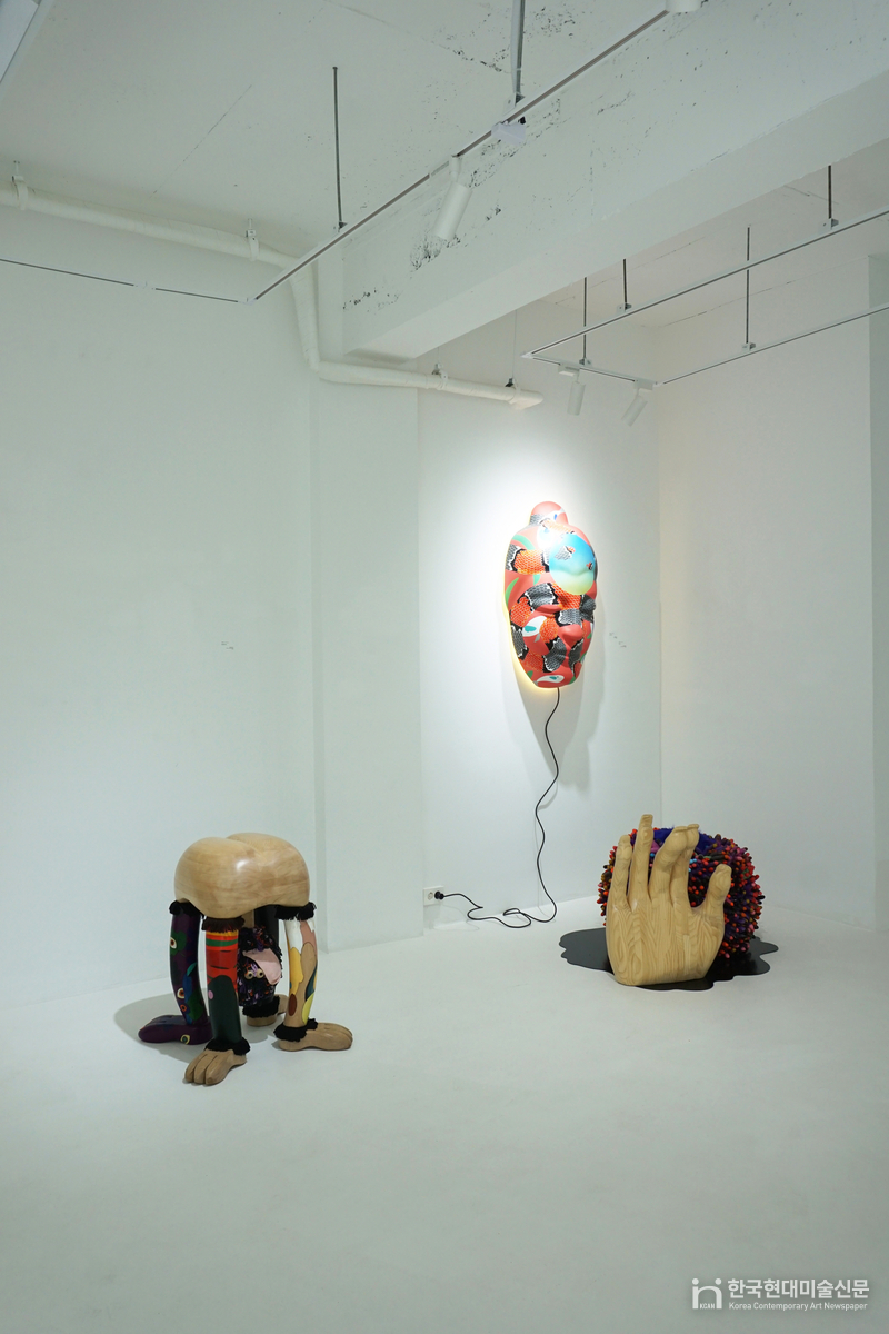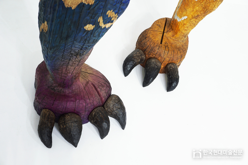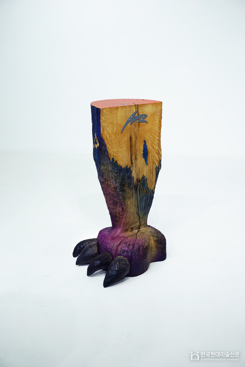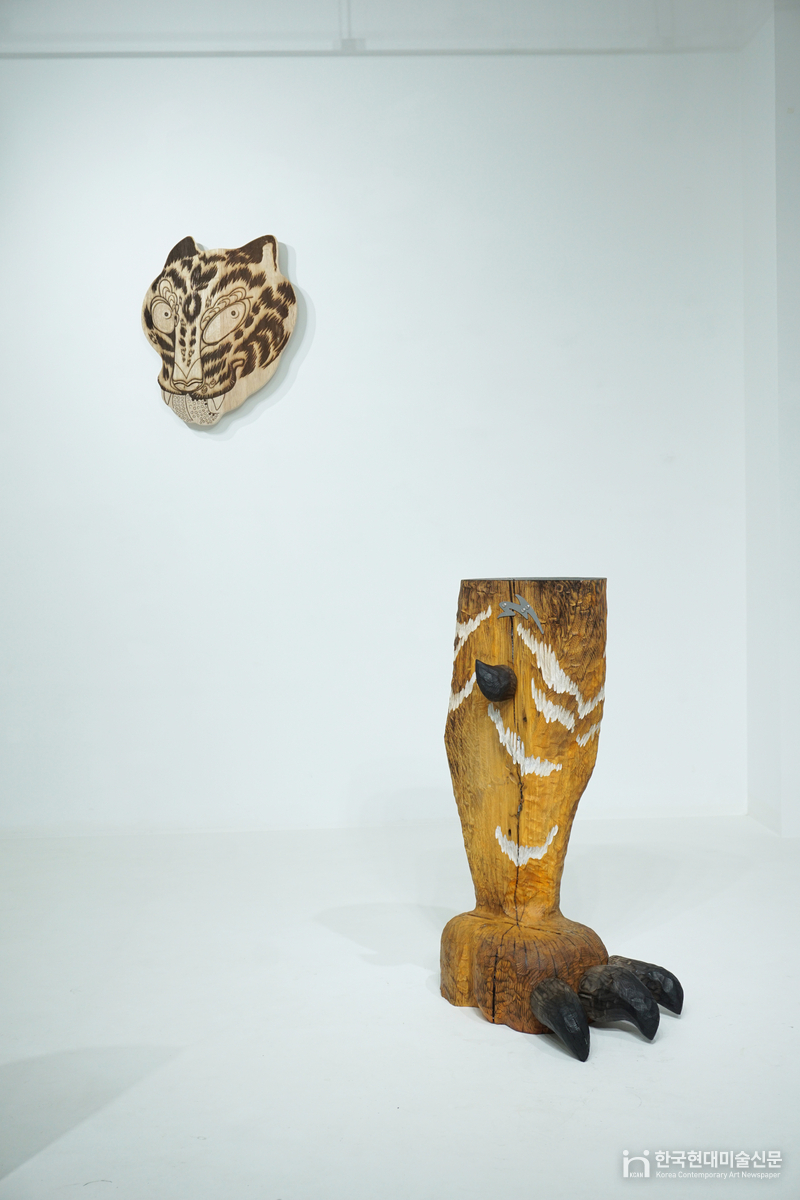 그의 작업에서는 이들 사물이 단순히 미신적 도구로 머무르는 것이 아니라, 인간이 세계를 이해하고 체험하는 하나의 언어로 기능한다. 전시장에 들어서면 일상의 물건이 나무 조각으로, 가구로, 거대한 발톱으로 변형되어 등장한다. 벽면을 따라 굽이치는 구렁이 형상의 구조물, 호랑이 발을 닮은 나무 조형물 등이 공간 전체를 ‘보이지 않는 기운’이 흐르는 장처럼 만든다.