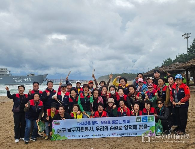 한국현대미술신문 정소영 기자 | 대구 남구는 지난 10월 21일 대구남구자원봉사센터와 함께 자원봉사자 40명이 올해 3월 대형 산불 피해를 겪은 경북 영덕지역에서 재난대응 중심 봉사활동을 펼쳤다.