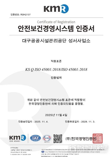 한국현대미술신문 정소영 기자 | 대구공공시설관리공단 성서사업소는 11월 4일, 한국경영인증원이 실시한 안전보건경영시스템 국제표준(ISO45001) 인증 심사에서 ‘적합’ 판정을 받았다.