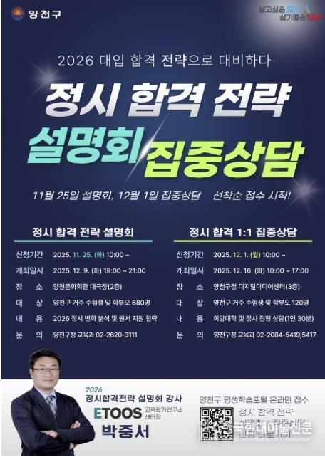 ‘2026학년도 대입 정시 합격 전략 설명회’는 12월 9일 오후 7시, 양천문화회관 대극장에서 열린다. 이투스 교육평가연구소 박중서 센터장이 강사로 나서 ▲정시모집 요강 분석 ▲대학별 수능 점수 환산방법 ▲주요 대학 지원 전략 ▲합격 사례 분석 결과 등 합격 비법을 상세히 알려줄 예정이다.