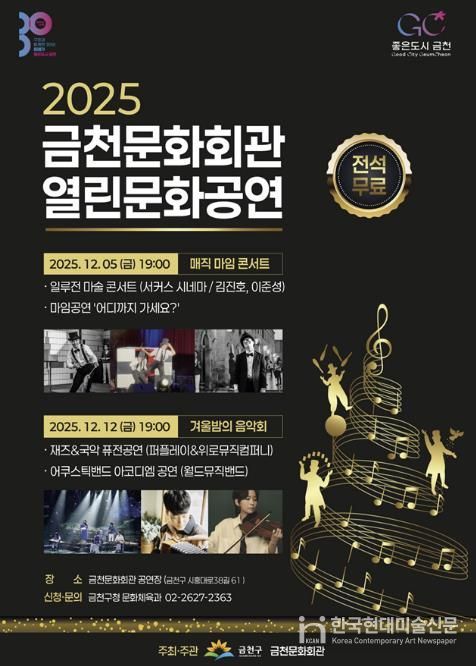한국현대미술신문 배건 기자 | 금천구는 오는 12월 5일과 12월 12일 오후 7시, 두 차례에 걸쳐 금천문화회관에서 기획공연 ‘2025 금천문화회관 열린문화공연’을 개최한다고 밝혔다.