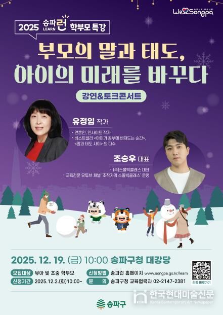 한국현대미술신문 배건 기자 | 서울 송파구가 내달 19일 10시 구청 4층 대강당에서 올해 마지막 학부모 특강 '부모의 말과 태도, 아이의 미래를 바꾸다'를 개최한다고 알렸다.