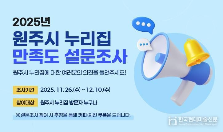 한국현대미술신문 원진 기자 | 원주시는 시정 정보를 제공하는 주요 창구인 대표 누리집의 이용 만족도를 높이기 위해 오는 12월 10일까지 ‘원주시 누리집 만족도 조사’를 실시한다.