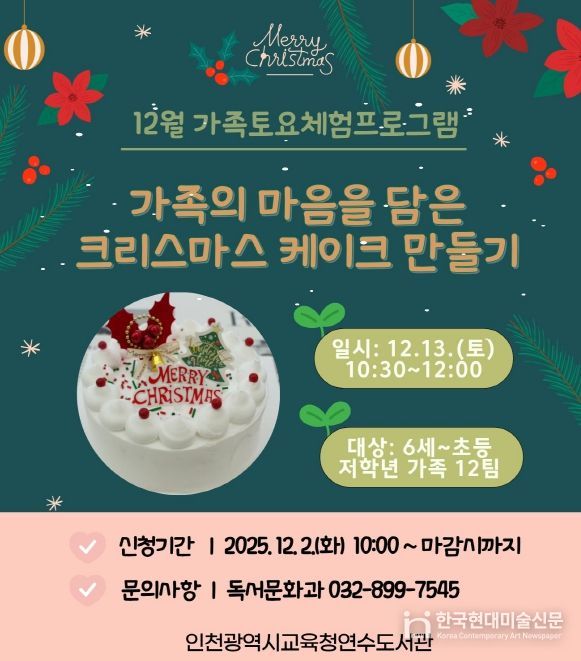 한국현대미술신문 박재남 기자 | 인천광역시교육청연수도서관은 12월 13일 오전 10시 30분 평생학습1실에서 가족 단위 이용자를 대상으로 ‘12월 가족 토요체험 프로그램’을 운영한다.