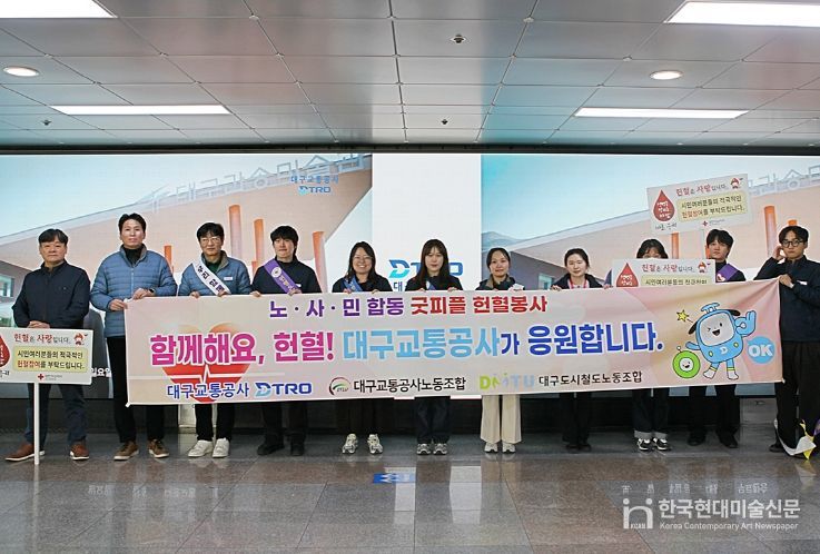 한국현대미술신문 정소영 기자 | 대구교통공사는 지난 11월 27일 상인동 본사와 월배·문양·칠곡경전철 차량기지 등 총 4개 사업장에서 ‘노·사·민이 함께하는 생명 나눔 헌혈행사 및 헌혈 참여 캠페인’을 진행했다.