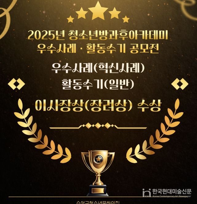 한국현대미술신문 정소영 기자 | 대구 수성구청소년문화의집 청소년방과후아카데미가 지난 28일 한국청소년활동진흥원이 주관한 ‘2025년 청소년방과후아카데미 우수사례(혁신사례)·활동수기(일반) 공모전’에서 각각 이사장상(장려상)을 수상했다고 밝혔다.