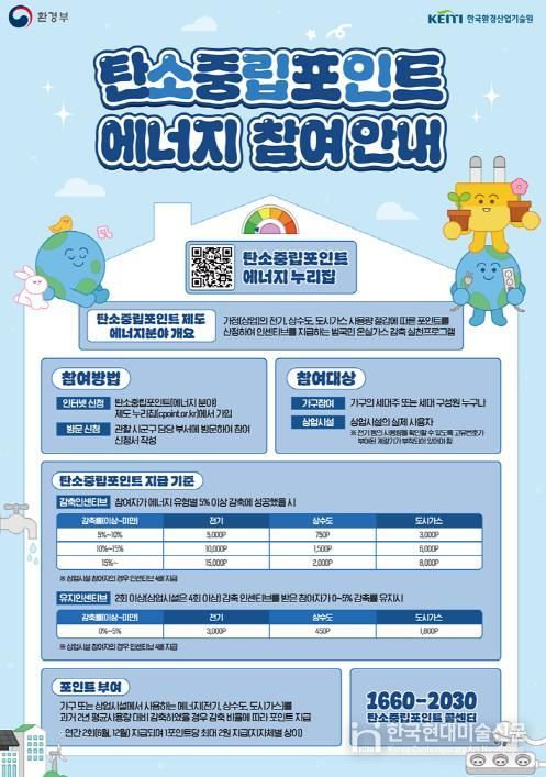 탄소중립포인트제는 가정에서 전기·수도·가스 사용량을 절감하거나 자동차 운행거리를 줄일 경우, 그 실적에 따라 포인트를 적립해 인센티브로 환급하는 제도다. 시민이 일상생활 속에서 손쉽게 참여할 수 있는 생활밀착형 탄소중립 정책으로 자리매김하고 있다.