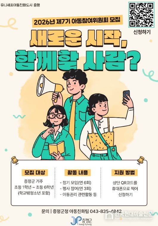한국현대미술신문 신정은 기자 | 충북 증평군이 아동의 시선에서 지역 정책을 함께 만들어갈 ‘제7기 증평군 아동참여위원회’ 위원 35명을 오는 3월 31일까지 공개 모집한다.