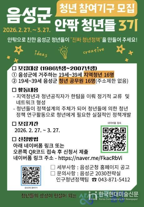 한국현대미술신문 신정은 기자 | 음성군은 청년공무원과 지역청년이 협력하여 청년에 의한 ‘진짜’ 청년정책을 만드는 청년 참여기구 ‘안팎 청년들 3기’ 참여자를 모집한다고 밝혔다.