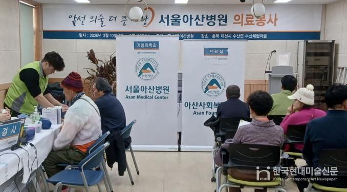한국현대미술신문 신정은 기자 | 제천시 수산면 ‘수산체험마을’ 1층에서는 수산면 주민자치위원회 주관으로 서울아산병원 의료봉사팀의 이동병원 진료가 진행돼 지역 주민들에게 따뜻한 온기를 전했다.