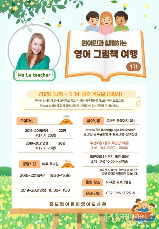 한국현대미술신문 박재남 기자 | 인천 동구는 꿈드림어린이영어도서관에서 오는 18일부터 ‘원어민과 함께하는 영어 그림책 여행(1기)’ 수강생을 선착순으로 40명 모집한다고 밝혔다.