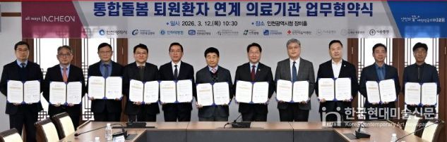 한국현대미술신문 박재남 기자 | 인천광역시는 3월 12일 시청 장미홀에서 상급종합병원 등 관내 10개 의료기관과 함께 '통합돌봄 퇴원환자 지역사회 연계 활성화를 위한 업무협약(MOU)'를 체결했다고 밝혔다,
