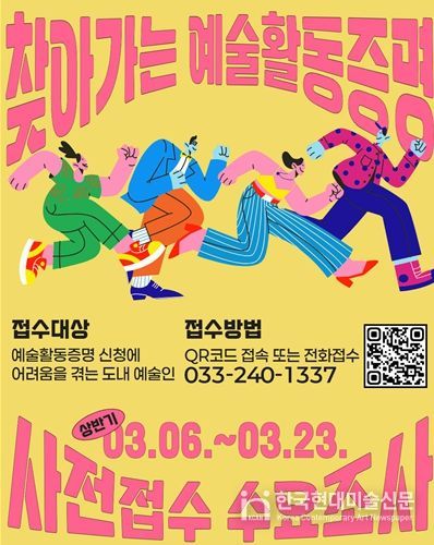 한국현대미술신문 원진 기자 | 강원문화재단은 도내 예술인의 복지 제도 접근성을 높이기 위한 ‘2026년 상반기 예술활동증명 등록지원 서비스’ 사전접수를 23일(월)까지 진행한다.