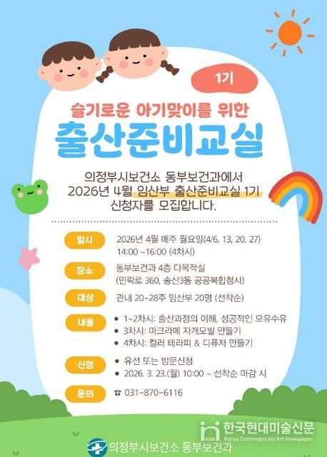 한국현대미술신문 배윤섭 기자 | 의정부시 보건소 동부보건과는 관내 20~28주 임산부를 대상으로 ‘임산부 출산준비교실’ 프로그램 1기 대상자 20명을 3월 23일부터 선착순 모집한다.