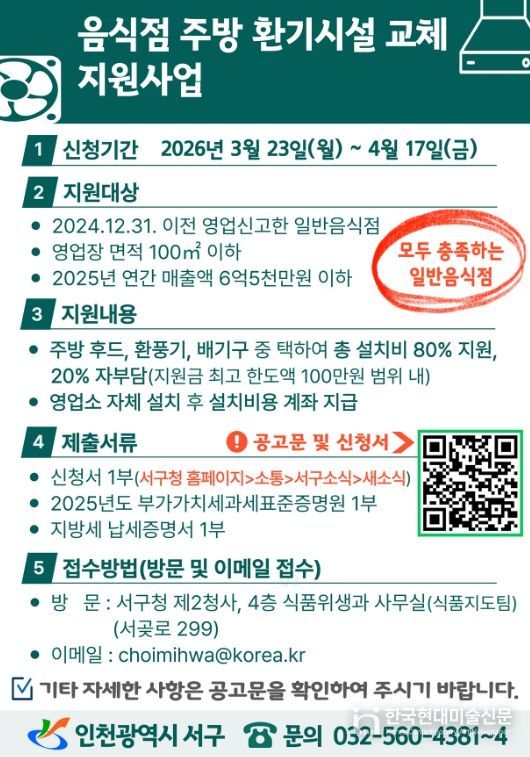 한국현대미술신문 박재남 기자 | 인천 서구는 식품사고 예방과 음식점 주방 환경 개선을 위해 ‘음식점 주방 환기시설 교체 지원사업’을 추진한다고 밝혔다.