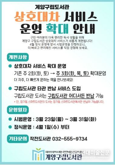 한국현대미술신문 박재남 기자 | (재)인천광역시계양구인재양성장학교육재단 계양구립도서관은 오는 4월 1일부터 상호대차 서비스 운영을 확대하고, 타관 반납 서비스를 새롭게 도입한다.