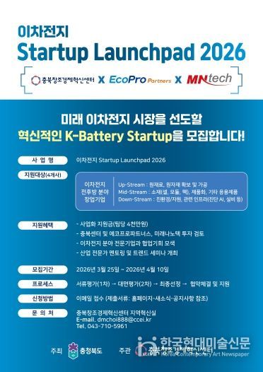 한국현대미술신문 신정은 기자 | 충북도가 이차전지 혁신 기술을 보유한 스타트업을 발굴해 육성하는 '이차전지 스타트업 육성 플랫폼 구축 지원사업(이차전지 Startup Launchpad 2026)' 참여 기업을 4월 10일까지 모집한다.