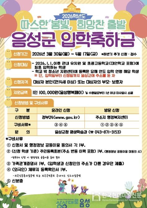 한국현대미술신문 신정은 기자 | 음성군은 올해 2026학년도 입학을 맞아 관내 유치원과 초·중·고등학교 입학생, 그리고 학교 밖 청소년지원센터에 등록된 입학 연령에 해당되는 청소년을 대상으로 입학축하금을 지원한다고 밝혔다.