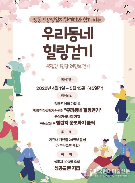 한국현대미술신문 신정은 기자 | 충북 음성군 맹동건강생활지원센터는 주민들의 걷기 실천율을 높이고 비만, 우울, 고혈압 등 기저질환 관리를 돕기 위해 오는 4월부터 ‘우리동네 힐링걷기’ 챌린지를 운영한다.