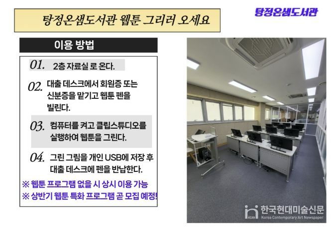 한국현대미술신문 신정은 기자 | 아산시는 시민들의 창작 역량을 지원하고 웹툰 특화 도서관으로서의 기능을 강화하기 위해 탕정온샘도서관에 웹툰창작실을 새롭게 조성하고 본격 운영에 들어간다.