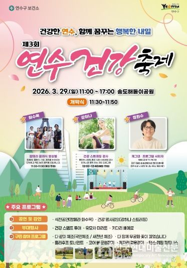 한국현대미술신문 박재남 기자 | 연수구는 오는 3월 29일 송도해돋이공원 잔디광장 일대에서 구민 누구나 참여하고 즐길 수 있는 ‘제3회 연수 건강축제’를 개최한다.