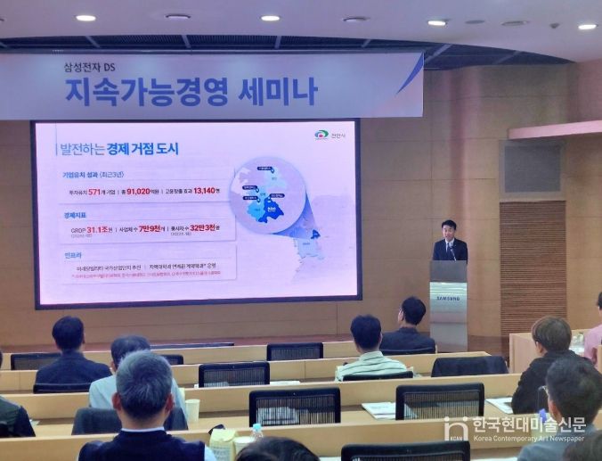 천안시는 31일 삼성전자가 개최한 ‘2026 상반기 지속가능경영 세미나’에 참여해 천안만의 차별화된 투자 환경과 지원책을 홍보하며 기업 유치 활동을 펼쳤다.