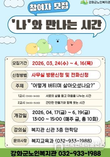 한국현대미술신문 박재남 기자 | 강화군노인복지관이 어르신들의 정서적 안정과 사회적 관계 형성을 지원하는 이야기 나눔 모임 '‘나’와 만나는 시간'의 참여자를 모집한다고 밝혔다.