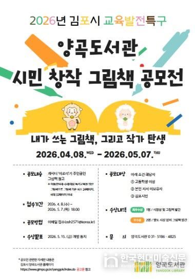 한국현대미술신문 배윤섭 기자 | 김포시 양곡도서관은 2026년 김포시 교육발전특구 사업의 일환으로 시민 작가를 발굴하고 유아 독서교육의 기반을 마련하기 위해 ‘시민 창작 그림책 공모전’을 개최한다.