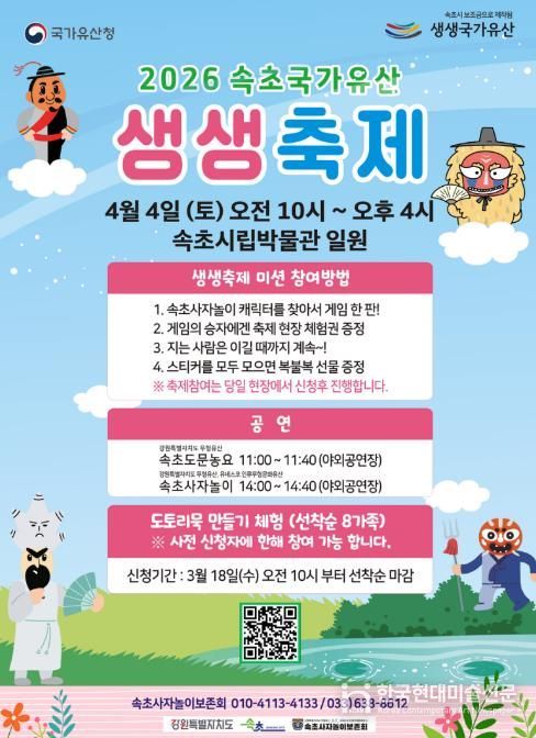 한국현대미술신문 원진 기자 | 국가유산청 공모사업인 ‘2026년 생생국가유산 사업’의 하나로 마련된 ‘2026 속초국가유산 생생축제’가 오는 4월 4일(토) 속초시립박물관에 열린다.