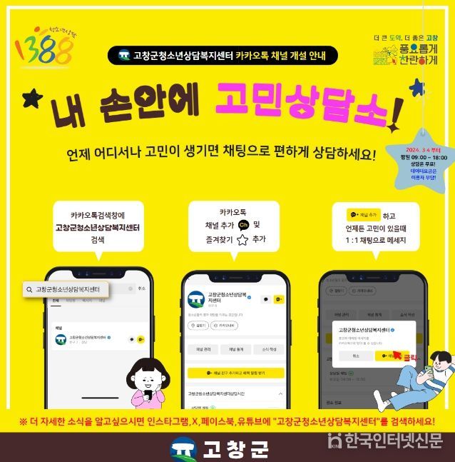 ‘내 손안에 고민상담소’ 카카오톡 채널 ‘고창군청소년상담복지센터’는 평일 오전 9시부터 오후 6시까지 운영된다.