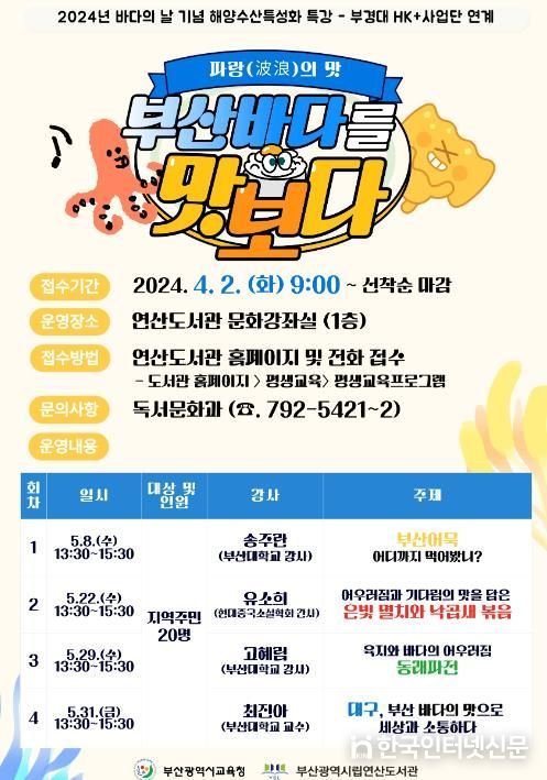 한국현대미술신문 정소영 기자 | 부산광역시립연산도서관은 오는 5월 8일부터 4회에 걸쳐 지역주민 20명을 대상으로 연산도서관 1층 문화강좌실에서 해양수산특성화 특강‘파랑(波浪)의 맛–부산바다를 맛보다’를 운영한다.