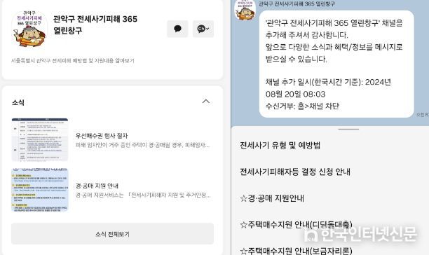 ‘전세사기피해 365 열린창구’는 구 홈페이지(분야별정보▷도시/주택/부동산▷전세사기피해 365 열린창구)와 카카오톡 채널(관악구 전세사기피해 365 열린창구)에서 확인할 수 있다.