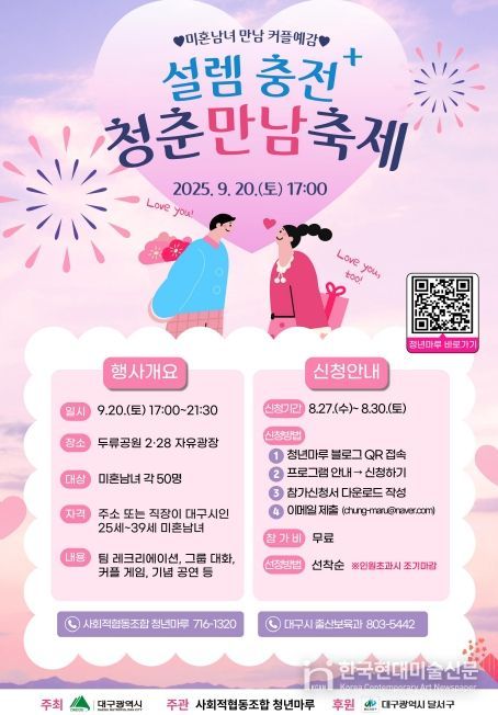 한국현대미술신문 정소영 기자 | 대구광역시는 오는 9월 20일 오후 5시, 두류공원 2.28자유광장에서 올해 미혼남녀 만남 행사의 대미를 장식할 ‘청춘 만남 축제’를 개최한다.