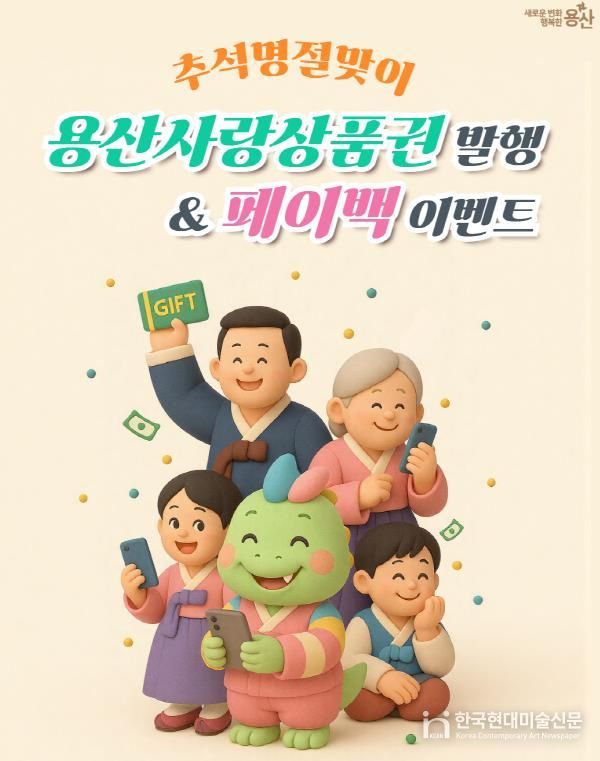 한국현대미술신문 배건 기자 | 서울 용산구는 추석 명절을 맞아 오는 9월 16일 오전 9시, ‘용산사랑상품권’ 110억 원을 발행한다고 밝혔다. 상품권은 ‘서울페이플러스(서울PAY+)’ 앱을 통해 구매할 수 있으며, 용산구 내 서울페이 가맹점에서 사용 가능하다.