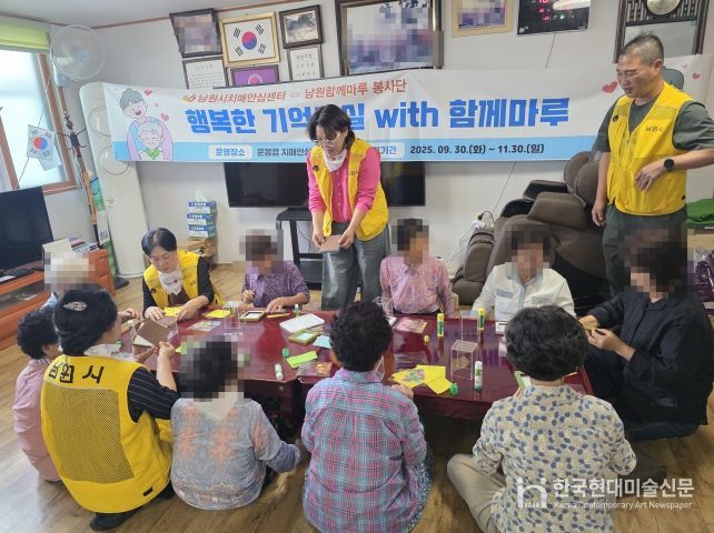 한국현대미술신문 기자 | 남원시치매안심센터(센터장 한용재)는 함께 마루 봉사단과 협력하여 오는 11월까지 운봉읍 관내 치매안심마을 4개 마을을 순회 방문하며 '행복한 기억교실 with 함께마루' 를 시범 운영한다고 밝혔다.