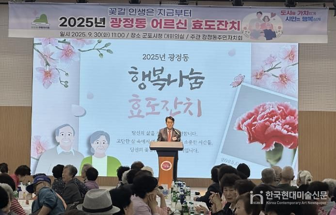 한국현대미술신문 배윤섭 기자 | 광정동 주민자치회는 9월 30일 노인의날(10월2일)을 앞두고 관내 어르신 250분을 모시고 “행복나눔 효도잔치” 를 개최하여 어르신들께 따뜻한 한끼 식사와 신명 나는 공연으로 즐거운 하루를 선사해드렸다.