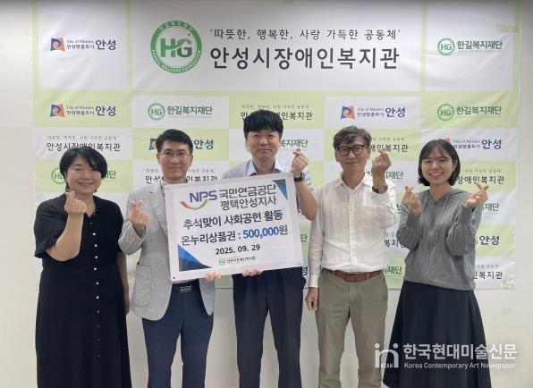 한국현대미술신문 배윤섭 기자 | 사회복지법인 한길복지재단에서 수탁하고 있는 안성시장애인복지관은 지난 9월 29일 국민연금공단 평택안성지사로부터 사회공헌활동으로 50만원 상당의 온누리 상품권을 후원받았다고 밝혔다.