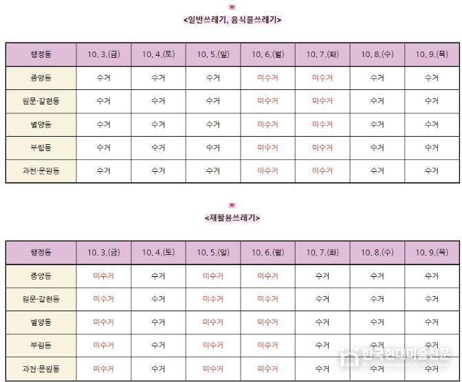 생활폐기물 수거는 일반 쓰레기의 경우 3일, 4일, 5일, 8일, 9일에, 재활용 쓰레기는 4일, 7일, 8일, 9일에 각각 수거된다.