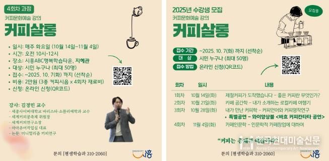 한국현대미술신문 배윤섭 기자 | 시흥시는 민간주도형 지역축제 지원사업인 ‘2025년 시흥시 지역특화 관광축제 지원사업’에 선정된 ‘세계 커피콩 축제’의 사전 연계 프로그램으로 커피문화예술 특강 ‘커피살롱’을 오는 10월 14일부터 11월 4일까지 시흥ABC행복학습타운 지혜관에서 총 4회에 걸쳐 진행한다.