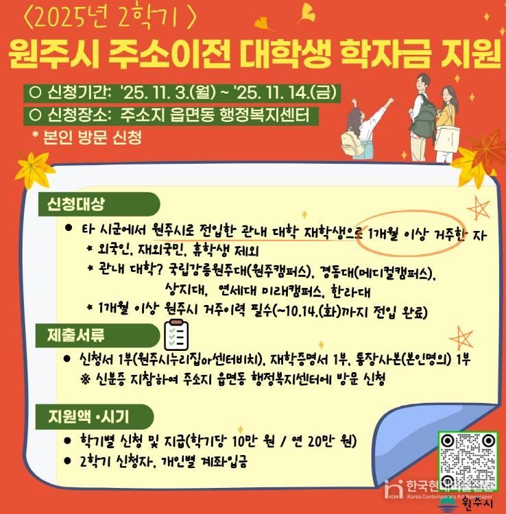 한국현대미술신문 원진 기자 | 원주시는 전입신고를 마치고 원주시민이 된 관내 대학생에게 상·하반기 각 10만 원씩 연 20만 원의 학자금을 지원하고 있다.