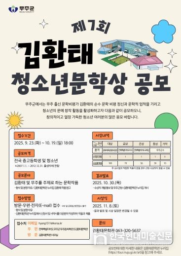 한국현대미술신문 기자 | 무주군이 전국의 중·고등학생 및 청소년(2007.1.1.~2012.12.31. 출생자에 한함)을 대상으로 제7회 김환태 청소년문학상에 도전하는 작품 공모에 나섰다.
