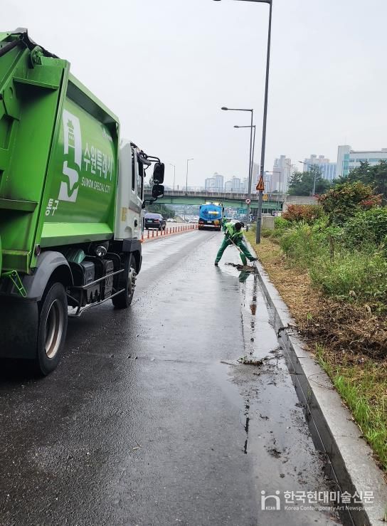 한국현대미술신문 배윤섭 기자 | 수원특례시 영통구는 '대한민국 새단장' 캠페인의 일환으로 민족 최대의 명절 추석을 맞아 고향을 찾는 귀성객들에게 쾌적하고 안전한 도로 환경을 제공하고자 영동고속도로 동수원나들목 진출입로 집중 환경정비를 실시했다.