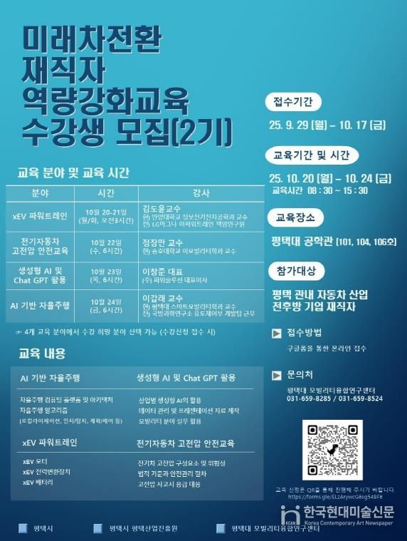 한국현대미술신문 배윤섭 기자 | 평택시와 평택산업진흥원이 ‘미래차 전환 재직자 역량 강화교육’ 2기 과정을 개설한다. 교육은 10월 20일부터 24일까지 교육 운영기관인 평택대학교에서 진행되며, 지역 자동차 산업 재직자를 대상으로 미래차 핵심 분야 전문지식을 제공한다.