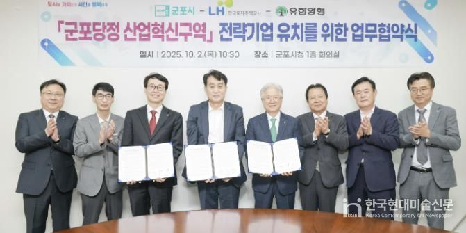 한국현대미술신문 배윤섭 기자 | 군포시는 2일 군포시청에서 한국토지주택공사(LH), ㈜유한양행과 ‘군포당정 산업혁신구역’ R·D 전략기업 유치를 위한 업무협약을 체결했다고 밝혔다.