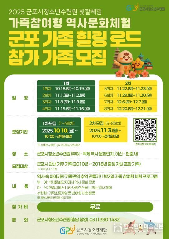 한국현대미술신문 배윤섭 기자 | 군포시청소년재단이 운영하는 군포시청소년수련원(충남 청양)은 관내 가족을 대상으로 2025년 가족참여형 역사문화탐방 '군포가족 힐링로드' 참가자를 모집한다.
