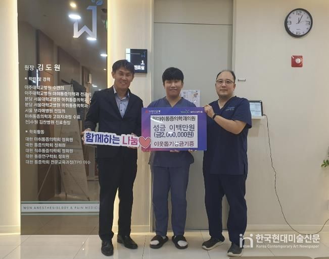 한국현대미술신문 배윤섭 기자 | 양주시 양주2동이 지난 1일 관내 원마취통증의학과의원에서 추석을 맞이하여 이웃돕기 성금 200만 원을 양주2동에 기탁했다고 밝혔다.