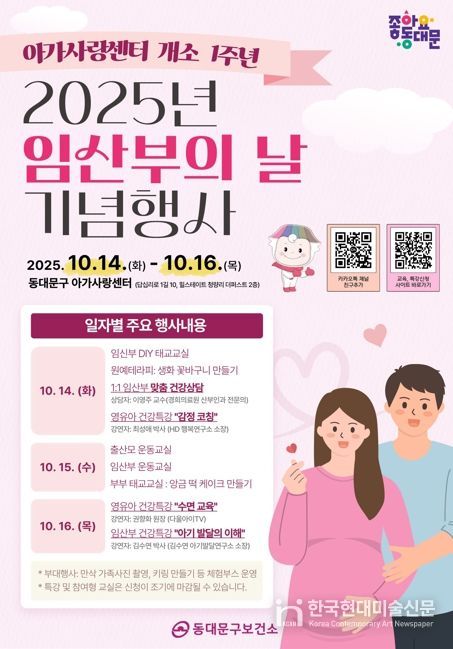 한국현대미술신문 배건 기자 | 서울 동대문구는 오는 14일부터 16일까지 아가사랑센터 개소 1주년과 ‘2025년 임산부의 날’을 맞아 다양한 기념행사를 개최한다고 밝혔다.