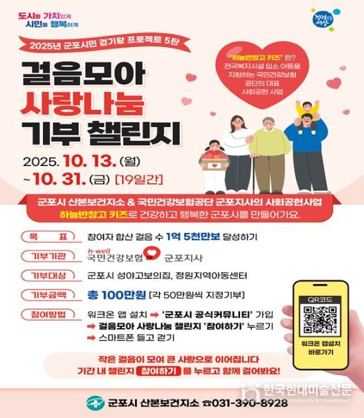 한국현대미술신문 배윤섭 기자 | 군포시 산본보건지소는 오는 10월 13일부터 31일까지(19일간) 국민건강보험공단 군포지사와 함께하는 '걸음모아 사랑나눔' 기부챌린지를 운영한다.