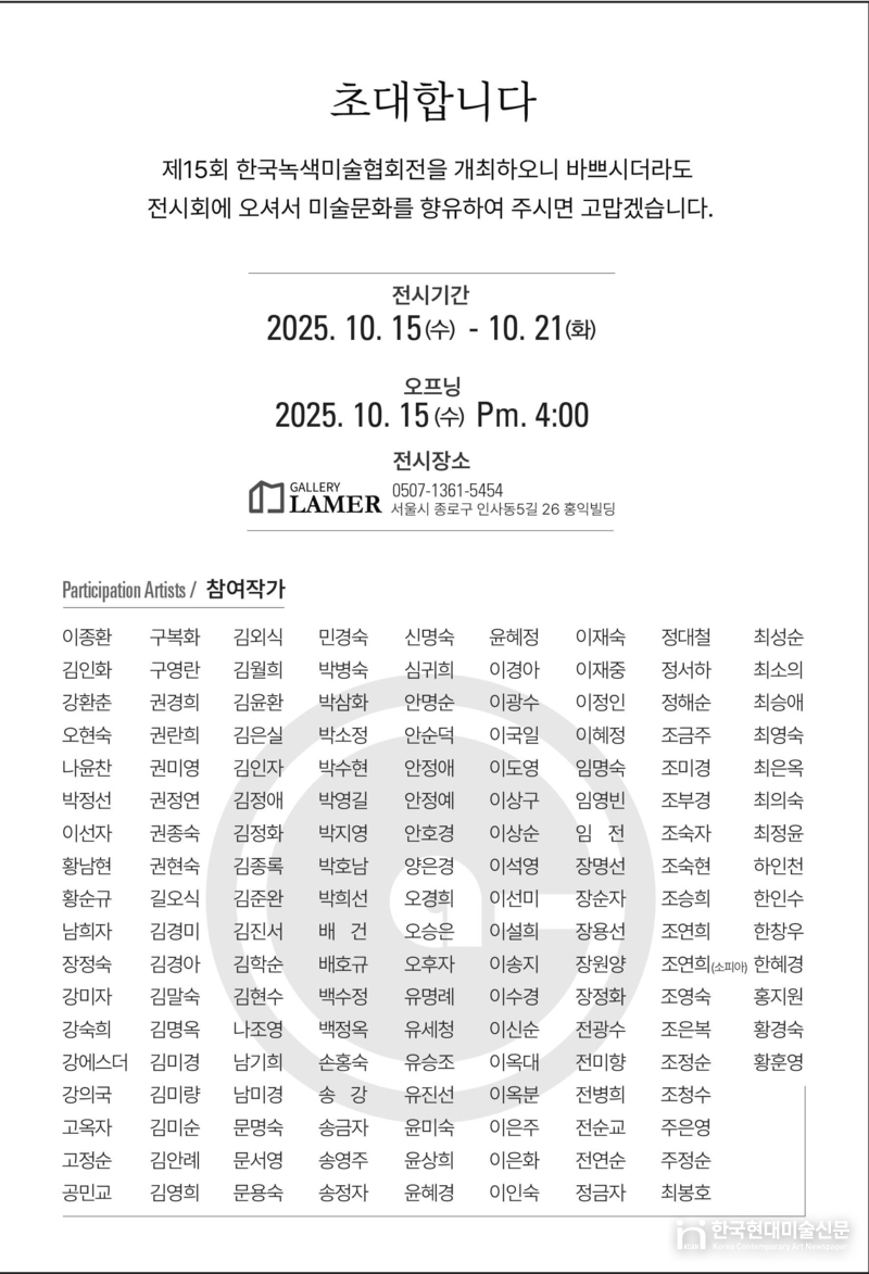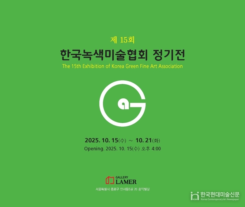 한국녹색미술협회(회장 황순규)가 주최하는 ‘제15회 정기전’이 오는 10월 15일(수)부터 10월 21일(화)까지 인사동 갤러리 라메르 3층 전관에서 열린다.